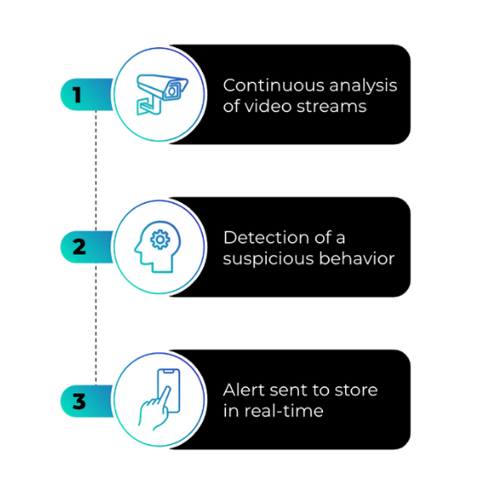Veesion’s strength lies in its ability to analyse, detect and alert. Our system analyses video data in real time, spotting behaviour that requires special attention. Thanks to its advanced artificial intelligence, it accurately identifies various types of gestures and actions, enabling rapid and appropriate intervention.