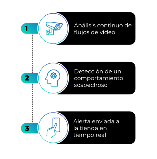 Si se detecta un comportamiento de riesgo, nuestro sistema alerta inmediatamente al personal afectado. Esta cadena de acción rápida y eficaz permite una intervención proactiva, contribuyendo a la seguridad del entorno de la tienda.